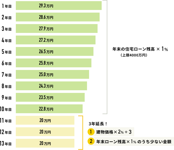 となり、少ない方の(1)20万円が住宅ローン控除の金額となります。12年目、13年目も同様に計算します。このケースではそれぞれの年で20万円ずつ控除が受けられるようになるため、建物3000万円に対する増税分60万円(3000万円×2%)が、3年で分割されて戻ってくることになります。