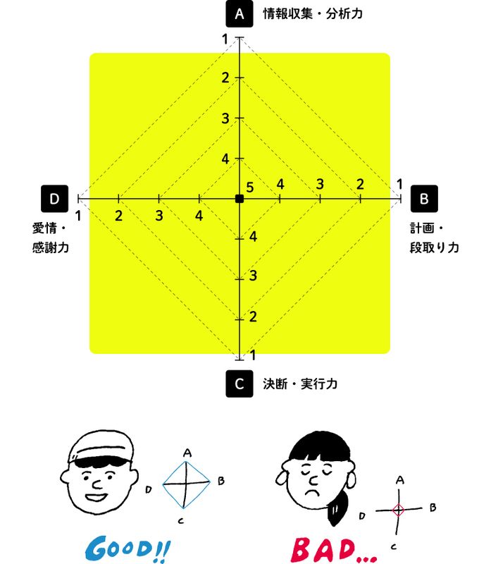 さらに全体の総得点を出して、総合判定を見てみましょう。グラフを作ることで、自分の得意・不得意の分野がわかります。