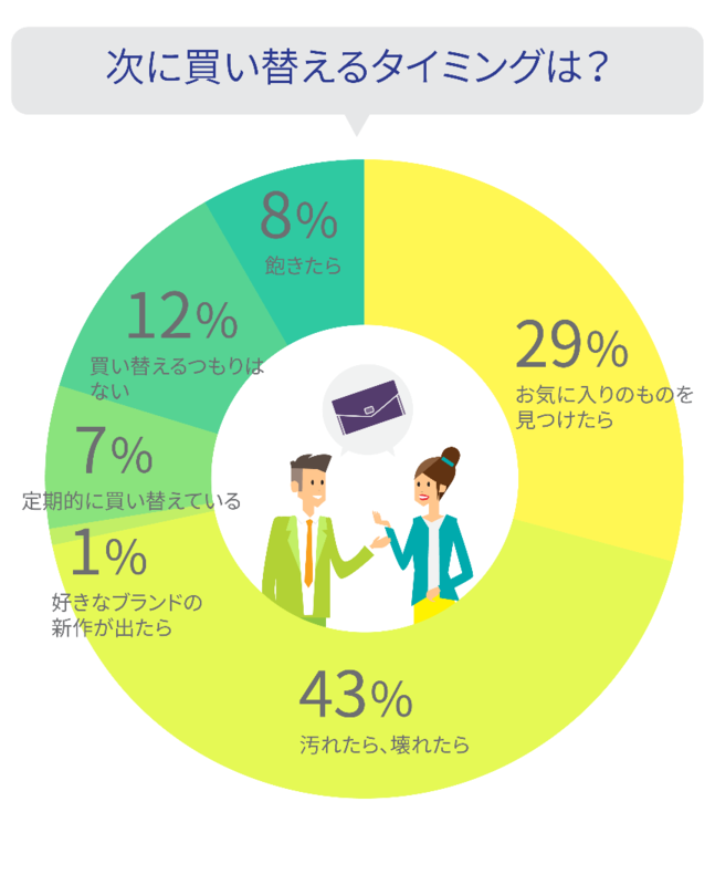 「汚れたら、壊れたら」が43%で最も多く、次いで、「お気に入りのものを見つけたら」が29%、「買い替えるつもりはない」が12%という結果に。