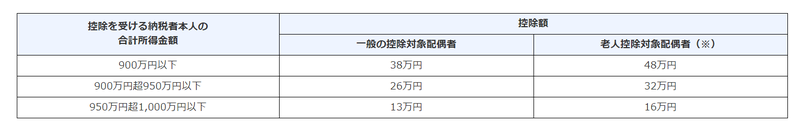控除額は、控除を受ける納税者本人の合計所得金額、及び控除対象配偶者の年齢により次の表のとおりになります。