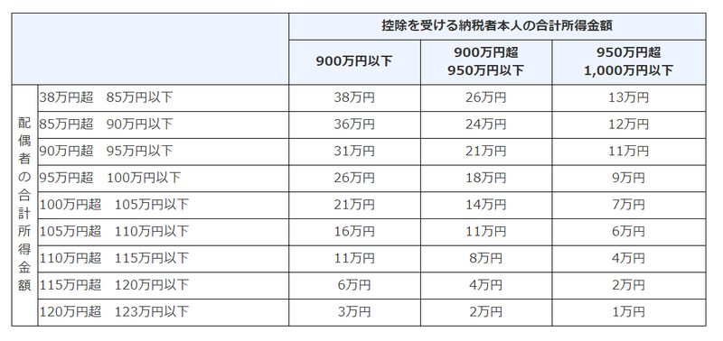 控除額は、控除を受ける納税者本人のその年における合計所得金額及び配偶者の合計所得金額に応じて次の表のようになります。