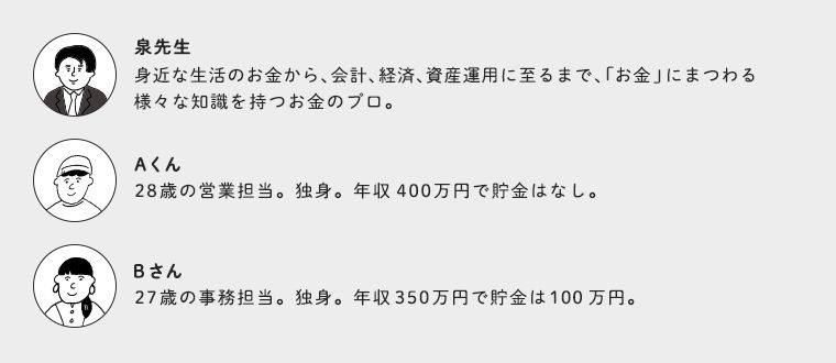 ここでは毎回、お金のプロ・泉正人先生が、社会に出て約5年になる20代のA君、Bさんに、お金のことをもっと身近に、楽しく考えてもらえるようなレクチャーを行っています。お金について知ることができた人には、今よりももっと自由な日々が待っている!