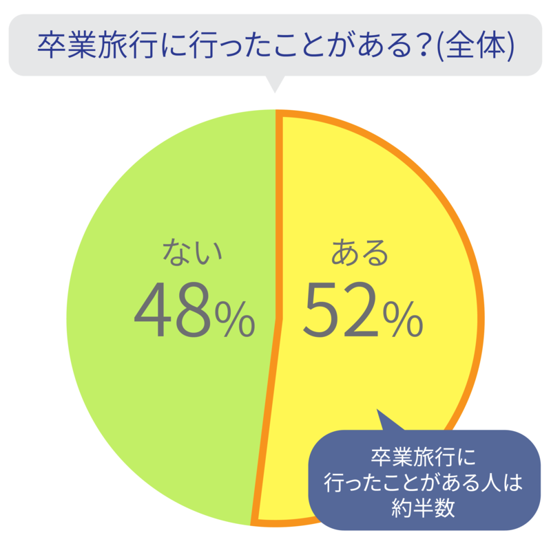今回の調査では、52%、約半数の方が「卒業旅行に行ったことがある」と答えました。