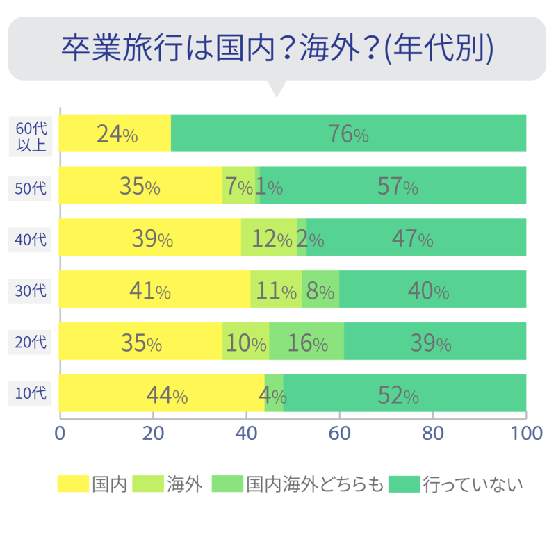 10代は大学や専門学校等へ進学する方もいらっしゃいますので、卒業旅行に行ったことの無い方が多いです。行っている人は、ほとんどが国内旅行です。