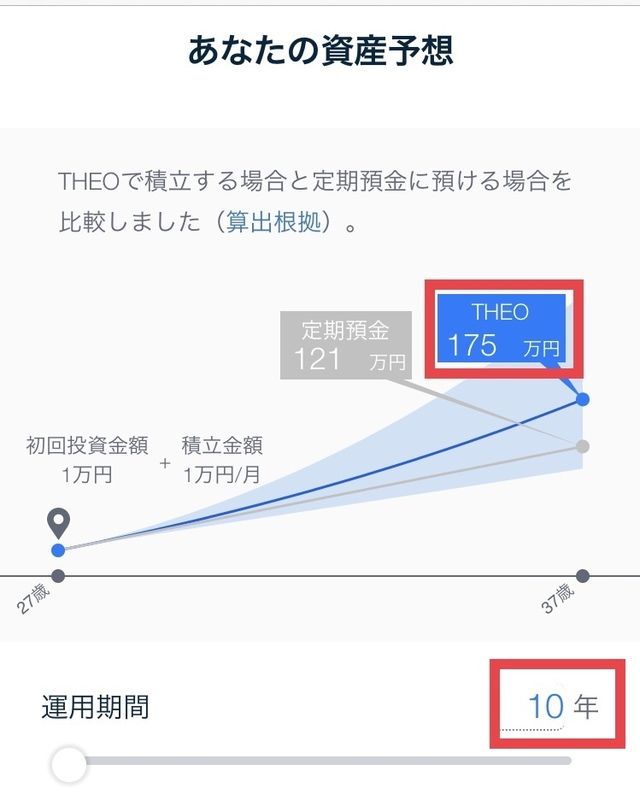 THEO+のサービスを使って年齢、積立期間、積立額などを入力してみることで簡単なシミュレーションが体験できます。チェックしてみてください。