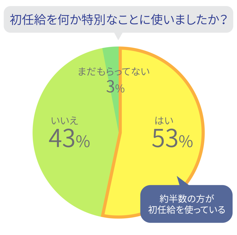 今回の調査では、全体の53%、約半数の方が、初任給を特別なことに使ったことが分かりました。