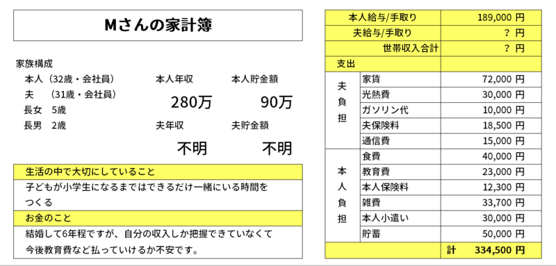 夫の収入が分からず家計が不安な32歳女性Mさんの相談