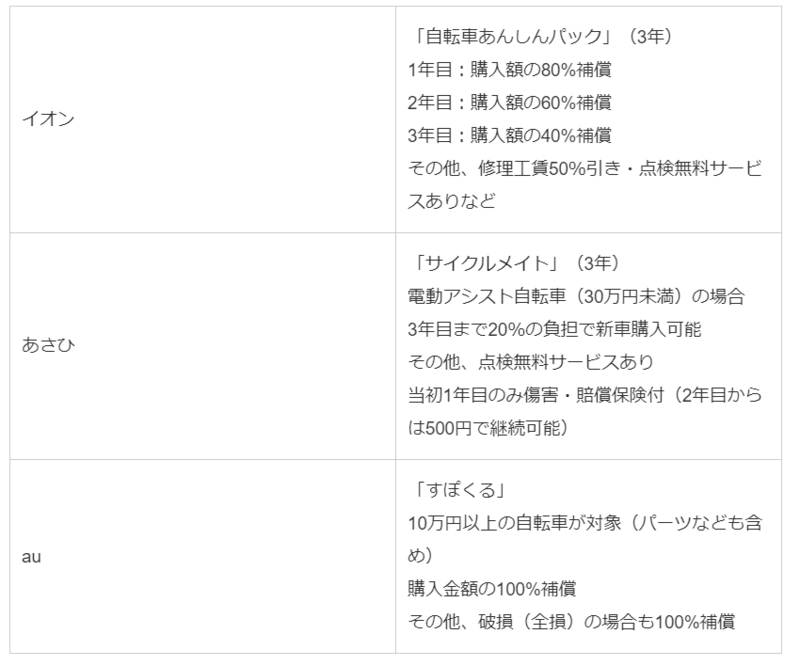 自転車を取り扱っているイオンやあさひが購入者に対して保険を提供しています。両社とも防犯登録もセットで行ってくれるため大変便利です。保険料はあさひの場合、2万円未満の自転車については3000円です。イオンの保険料は各購入店舗で確認が必要ですが、同程度の水準だと思われます。