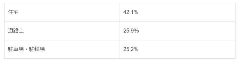 盗難発生場所で最も多いのが住宅の敷地内です。自宅の敷地内なら安心と思いがちですが、そんな隙を狙われるのかもしれません。なお、約6割が施錠していない状態で盗難されています。わずかな時間でもきちんと施錠をする意識を高めておきたいものです。