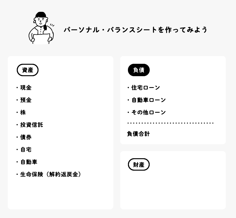 人生の目標を立てることができたら、「パーソナル・バランスシート」で現状の純資産を把握する。基本的な計算は、「資産-負債=純資産」。