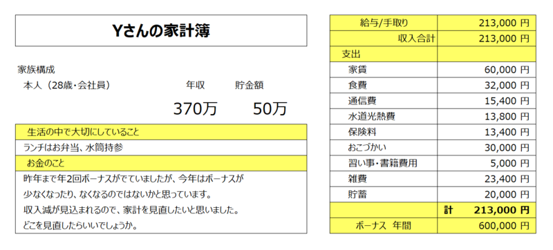 FPオフィス「フォルテシモ」へ依頼されたお客さまの家計簿を、mymoで診断する【うちの家計簿】。今回は、今年のボーナスが出ないかもしれず、貯金も乏しく、今後の収入減に不安を抱える一人暮らし28歳女性Yさんのご相談です。お金の使い方や家計の見直しポイントについて見ていきましょう