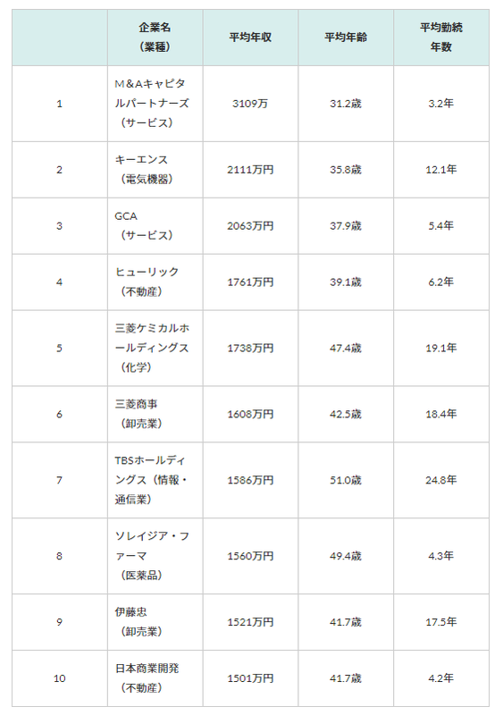 平均や中央値を紹介してきましたが、その中でも日本の企業で年収の高い10社を紹介します。1位はなんと3000万円を超えています。しかも平均勤続年数は3年程度です。もしかするとスポーツ選手のように厳しい成果報酬なのかもしれませんね。