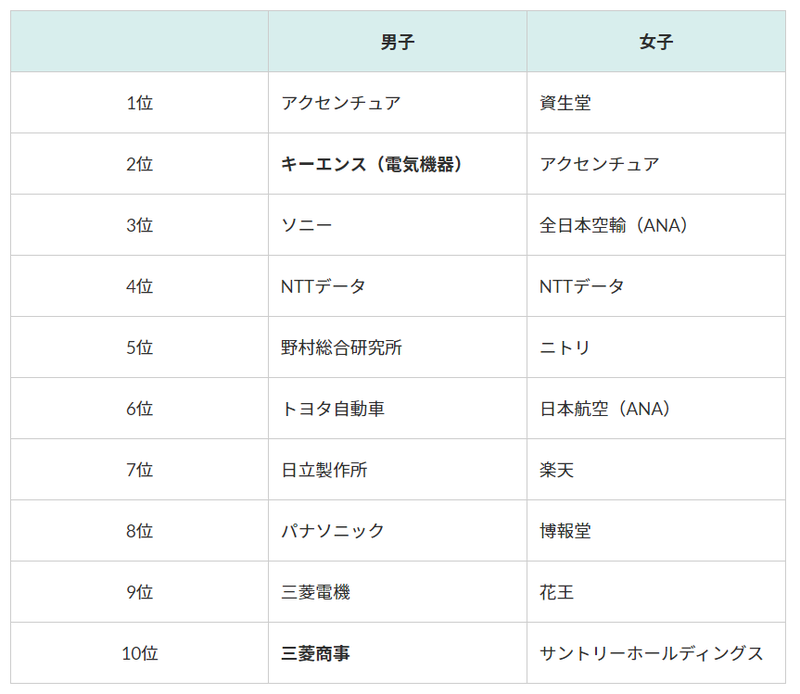 男子は2位キーエンス、10位三菱商事が高収入ランキングにも登場した企業が2社入っていますが、女子は1社もランクインしていません。必ずしも就職したい企業と年収は一致しないのかもしれません。
