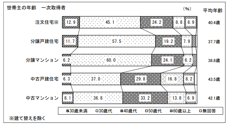 上の表は国土交通省が発表している「平成30年度住宅市場動向調査」から抜粋したものです。このグラフを見ると、注文住宅・分譲戸建住宅・分譲マンション・中古戸建住宅・中古マンションの5つの分類で購入者の平均年齢は30代後半から40代になっていますが、各分類において20代が一定の割合を占めていることが分かります。