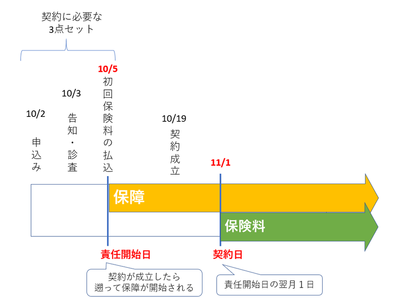 つまり、保険料が発生するのが契約日以降で、保障が開始するのが責任開始日以降ということです。