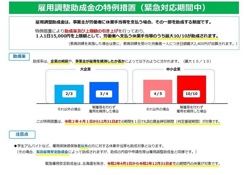 上記の表にあるように雇用を維持することを前提に助成率をアップさせており、まずは雇用を守るということを一番大きなテーマにしていることが分かります。
