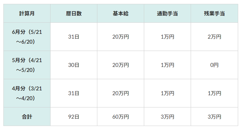 上の表を元に平均賃金を算出すると下記のような式になります。