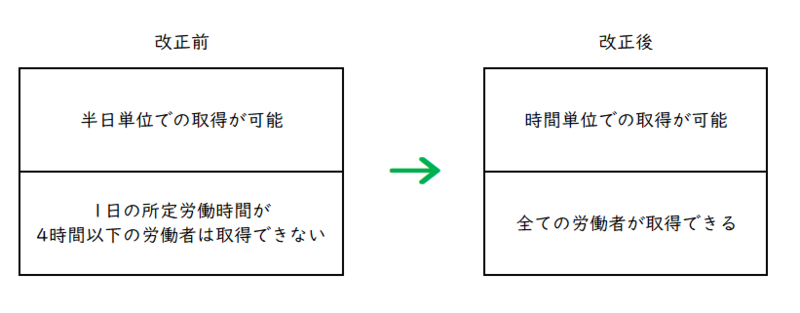 大きな変更点としては育児や介護を⾏う労働者が、「⼦の看護休暇」や「介護休暇」を柔軟に取得することができるように改正され、時間単位で取得できるようになります。