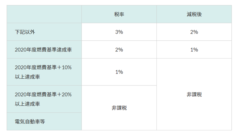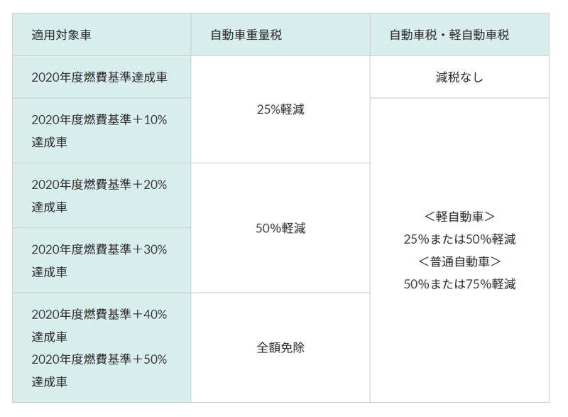 温暖化対策を推進する上で、省エネ法に基づき「2020年度燃費基準」が定められ、その達成度合いに応じて減税割合が以下のように決まっています。なお、自動車税・軽自動車税は「グリーン化特例」と呼ばれています。