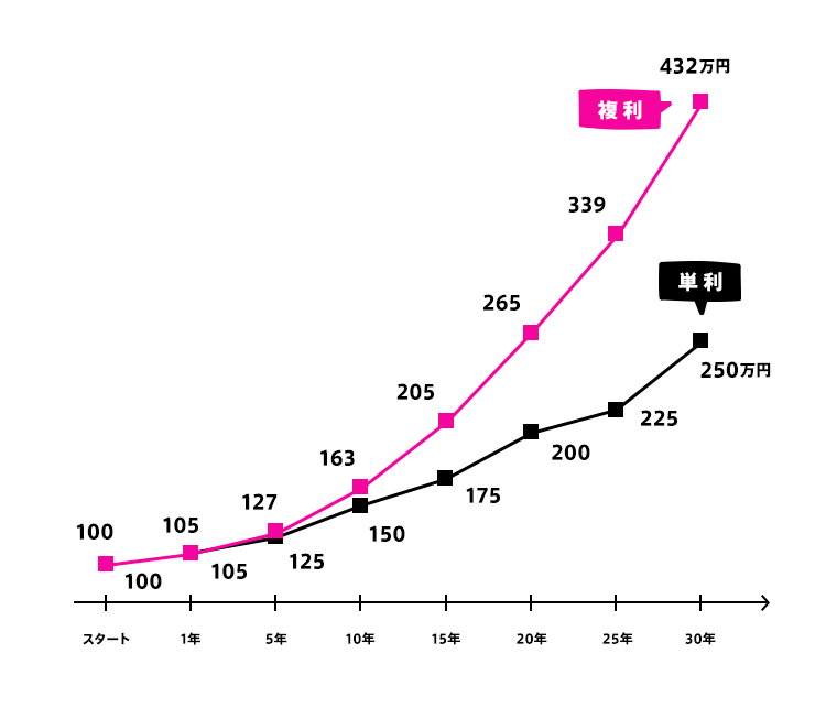そう。さらに、年月の経過とともに増えるスピードが加速度的に速くなっていくのも「複利効果」なんだ。5%と聞くと、一見小さな数字のように感じるけどね。