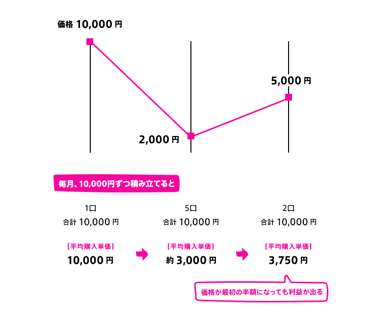 わかる、わかる。でも購入のタイミングを分けることで、購入後の値下がりリスクを避けることができるんだよ。例えば代表的な手法に、「ドル・コスト平均法」というものがあるんだけど、これは毎月一定の金額を決めて、定期的に購入しつづけることで、価格が高いときには少なく、価格が安いときには多く買えるというもの。投資信託の購入方法としてよく用いられる方法だから覚えておいて。