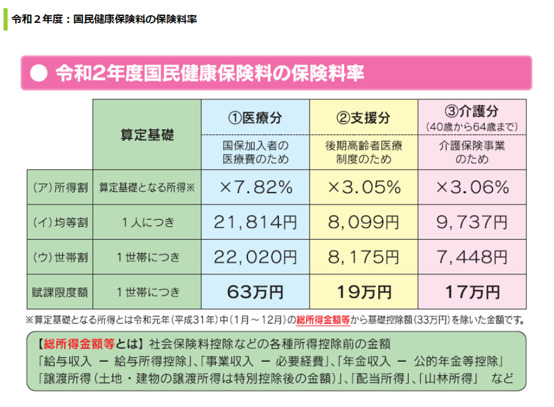 上記の図は福岡市の例ですが、国民健康保険の保険料は自治体ごとに異なります。自治体ごとに独自の掛け率を設定して保険料が決まるので、お住まいの地域の保険料は自治体で確認してください。