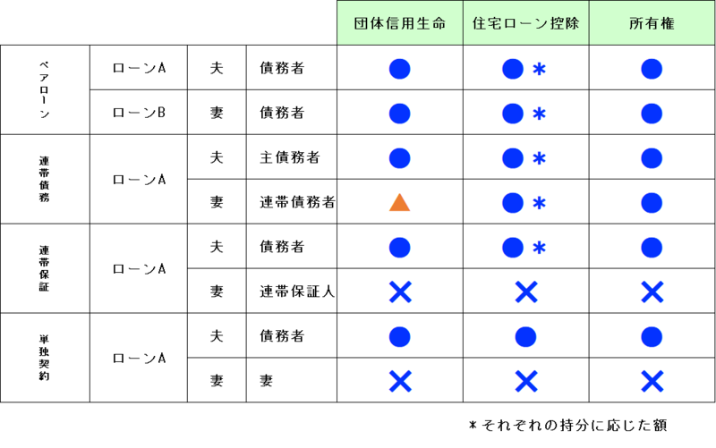 夫婦それぞれで住宅ローンを契約します。住宅ローン控除や団信もそれぞれに対応しています。ローンの契約を二つ行いますので事務手数料なども二つ分が必要です。