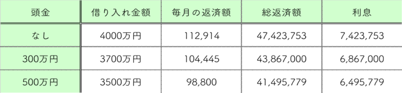 表から見てみると、頭金なし・フルローン時の総返済額は約4742万円です。一方、頭金500万円と、その場合の総返済額約4150万円を合わせるとおよそ4650万円になります。そうすると頭金なしのフルローンと頭金500万円の場合で比較しても差額は100万円程度です。