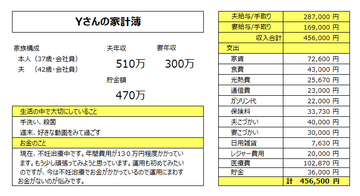 FPオフィス「フォルテシモ」へ依頼されたお客さまの家計簿を、mymoで診断する【うちの家計簿】、今回は会社員37歳女性Yさんの家計簿です。共働きのご夫婦で、数年前から不妊治療中で年間130万円程度医療費がかかっています。