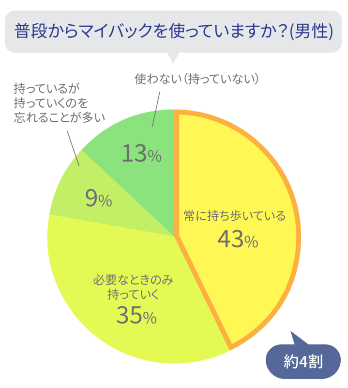 マイバッグを「常に持ち歩いている」人は、女性が70%であるのに対し、男性が43%と、かなり差が見られました。