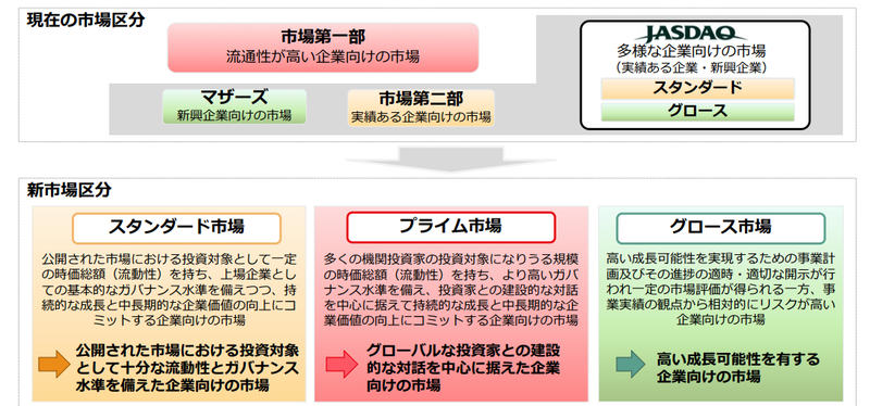 現在の東証1部が「プライム」に、東証2部とジャスダック・スタンダードが「スタンダード」に、ジャスダック・グロースとマザーズが「グロース」になります。