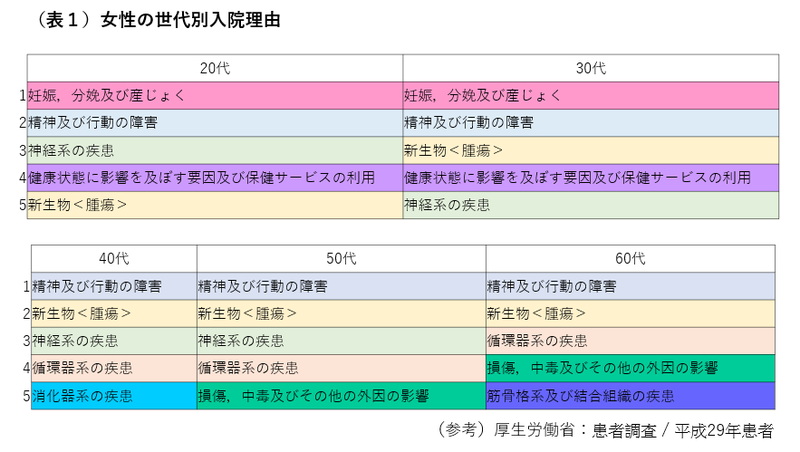 厚生労働省の患者調査(平成29年)を参考に入院した理由別、世代別で比較していきます。