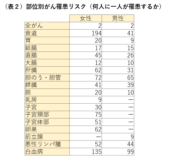 女性の場合、「乳房(9人に1人)」「子宮(30人に1人)」「子宮頚部(75人に1人)」「子宮体部(51人に1人)」「卵巣(62人に1人)」というような女性特有のがんの罹患が高いことが分かります。