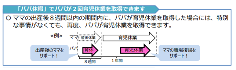 本来、育休は1回しか取得できませんが、男性(パパ)が女性(ママ)の産休中に一度育休を取得した際、もう一度別の機会に育休が取得できるという制度です。