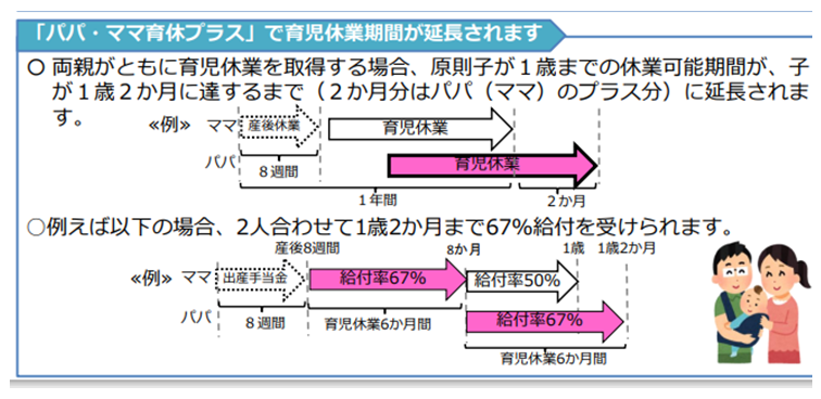 上の場合、2カ月+6カ月+6カ月で14カ月となります。育休取得可能期間が「子が1歳2カ月に達するまで」に延長されることで夫婦それぞれが効率的に休むことができるのです。