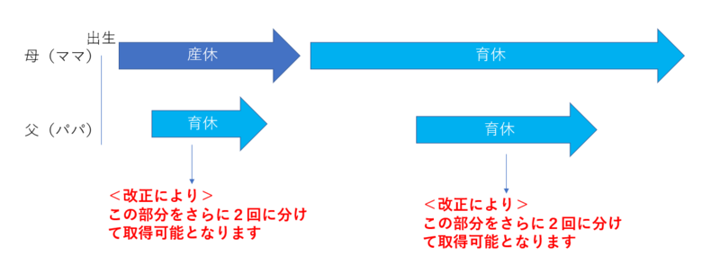 また、この休業中に事前に調整した上で就業も可能となります。よって、「周りに迷惑をかけるのでは」といったことを気にせず、柔軟に男性が“産休”を取ることが可能となります。また、もう一度取得することのできる育休も2回に分けて取得することができるようになります。