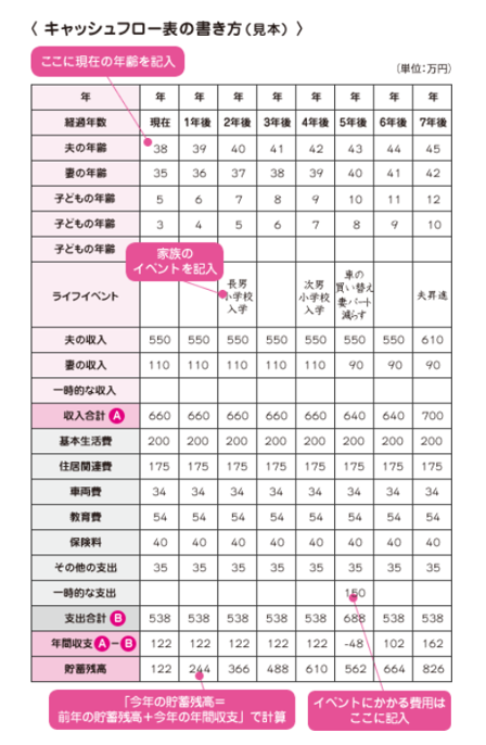 キャッシュフロー表とは、今の収入や支出、貯蓄額をもとに将来のイベントを踏まえて試算していく家計の未来年表です。