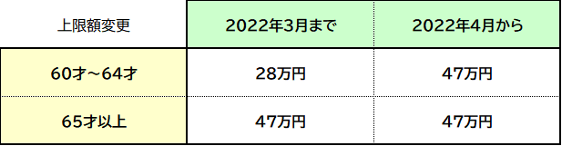 60才以上の老齢厚生年金の受給者を対象に、賃金と年金の合計額が一定金額以上になると年金額が削減される制度があります。現在は60才~64才の対象者が賃金・賞与と年金月額の合計が28万円/月を超えると年金が削減されるようになっていますが、この上限額が28万円/月から47万円/月へと緩和されます。