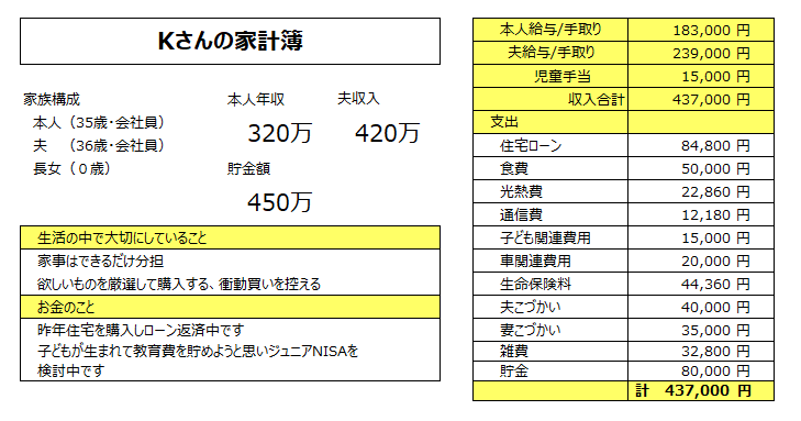 FPオフィス「フォルテシモ」へ依頼されたお客さまの家計簿を、mymoで診断する【うちの家計簿】。今回は会社員35歳女性、共働きで、お子さんが生まれたばかりのKさんの家計簿です。教育資金を準備するためにどんな金融商品を活用すればいいかというご相談です。