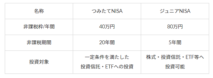 表のように、「つみたてNISA」と「ジュニアNISA」では、非課税で運用できる金額の上限や非課税期間などに違いがあります。