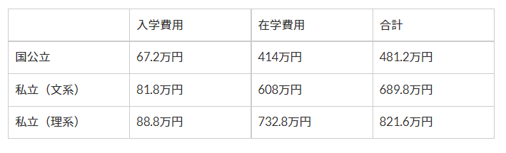 大学4年間でかかる費用
