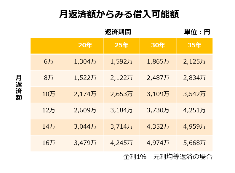 そこで、月返済額からみた借入可能額の表を基に借入額を考えてみましょう。