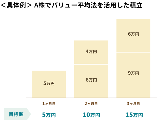 しかし、3カ月目には10万円分購入していたA株の株価が下がり、残高が9万円となりました。その場合は6万円を積み立てることで「3カ月で15万円」を達成します。