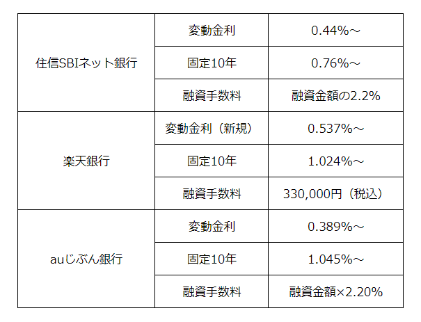 住宅ローンの新規借入時の金利(変動金利と当初10年間固定金利)は3行ともそれほど大きな差はありません。以前は店舗型の銀行と比べると金利の低さが際立っていましたが、現在はメガバンク、地方銀行いずれも大幅な金利引き下げを実施しており、ネットと実店舗での金利差もそれほど大きくないという印象です。