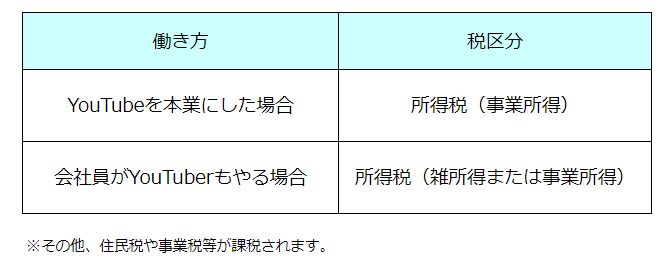 顔を出さず声だけで動画を投稿し、会社や身内に一切バレずに稼ぐこともできますが、顔出ししていなくても税金はしっかり手続きをして納めなければなりません。どんなチャンネル運営であっても、YouTuberとしてどのように働くかによって、税区分が以下のように異なります。