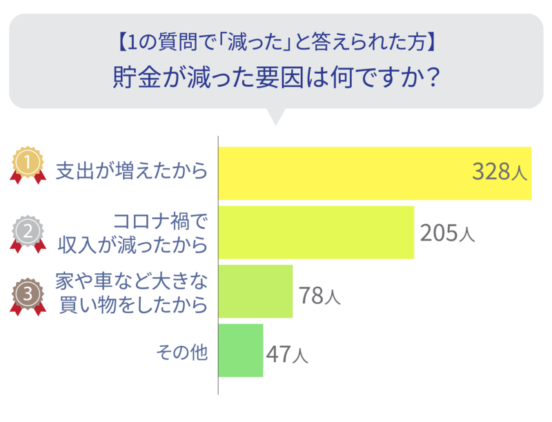 「支出が増えたから」が最も多く、次いで、「コロナ禍で収入が減ったから」、「家や車など大きな買い物をしたから」という結果になりました。
