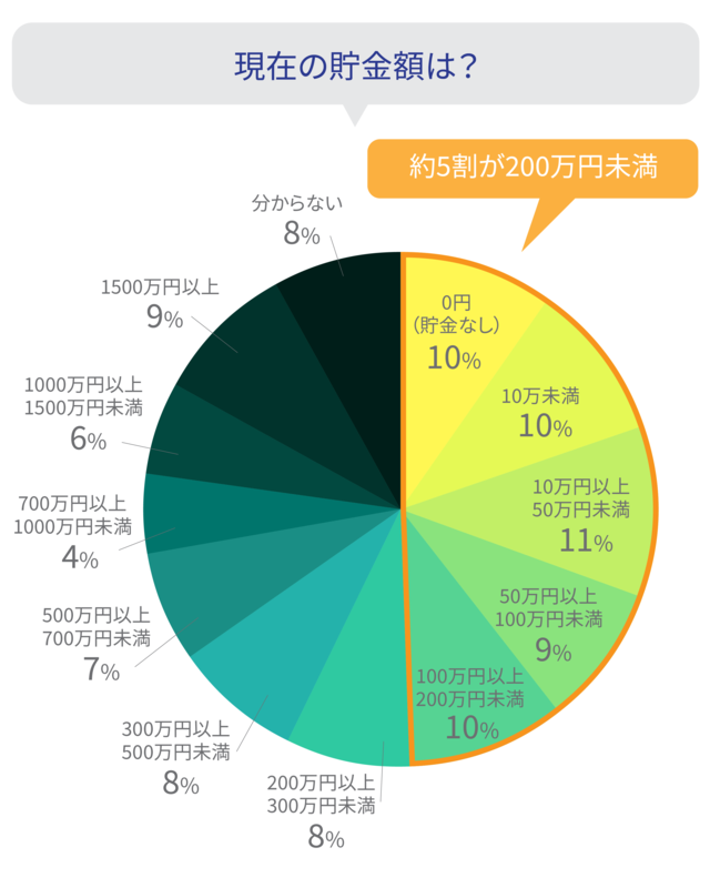 今回の調査では、半数の方が200万円未満であり、全体の1割の方は貯金が無い、という結果に。