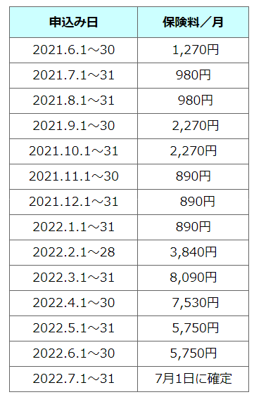 第一生命のグループ会社である第一スマートほけん(第一スマート少額短期保険株式会社)が提供する保険商品で、コロナウイルスやエボラ出血熱のような特定感染症(1~3類の感染症)にかかったと医師に診断されると特定感染症一時金が10万円給付されるというものです。10~69歳の方が加入でき、保険料は感染状況によって変動します。6月20日時点での保険料は5750円で、3カ月間保障されるようになっています。直近1年間の保険料は以下です。