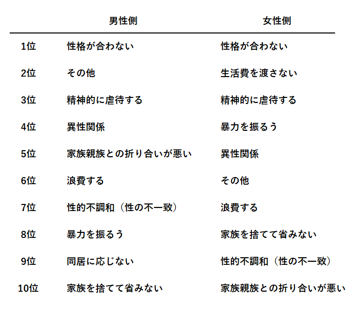 別れた原因から入るのもどうかと思いますが、とても大事なことなのであえて触れます。令和2年度の司法統計による、離婚調停の申し立ての主な理由は下記の通りです。