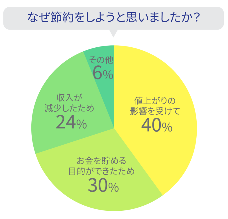 「値上がりの影響を受けて」という理由が40%と最も多く、次いで「お金を貯める目的ができたため」が30%、「収入が減少したため」が24%となりました。